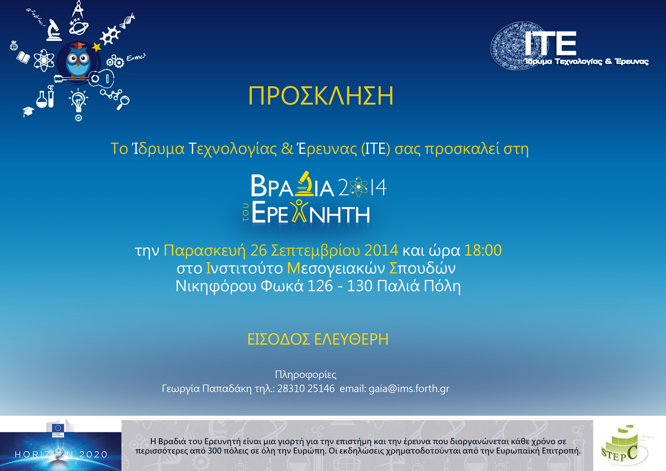 Σεπτεμβρίου στο πλαίσιο της «Βραδιάς Ερευνητή» και θα